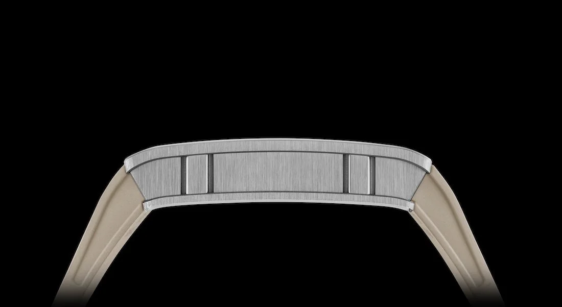 The extra-flat case is ergonomically refined compared to the original RM 016, now 10% smaller at only 36 x 45.65 mm, offering a more comfortable fit while preserving the brand's signature lines. In comparison, the RM 016 measures 38 x 49.80 mm with an ultra-thin case profile of 8.25 mm—pictured below— and with a date indicator at 7 o’clock.
