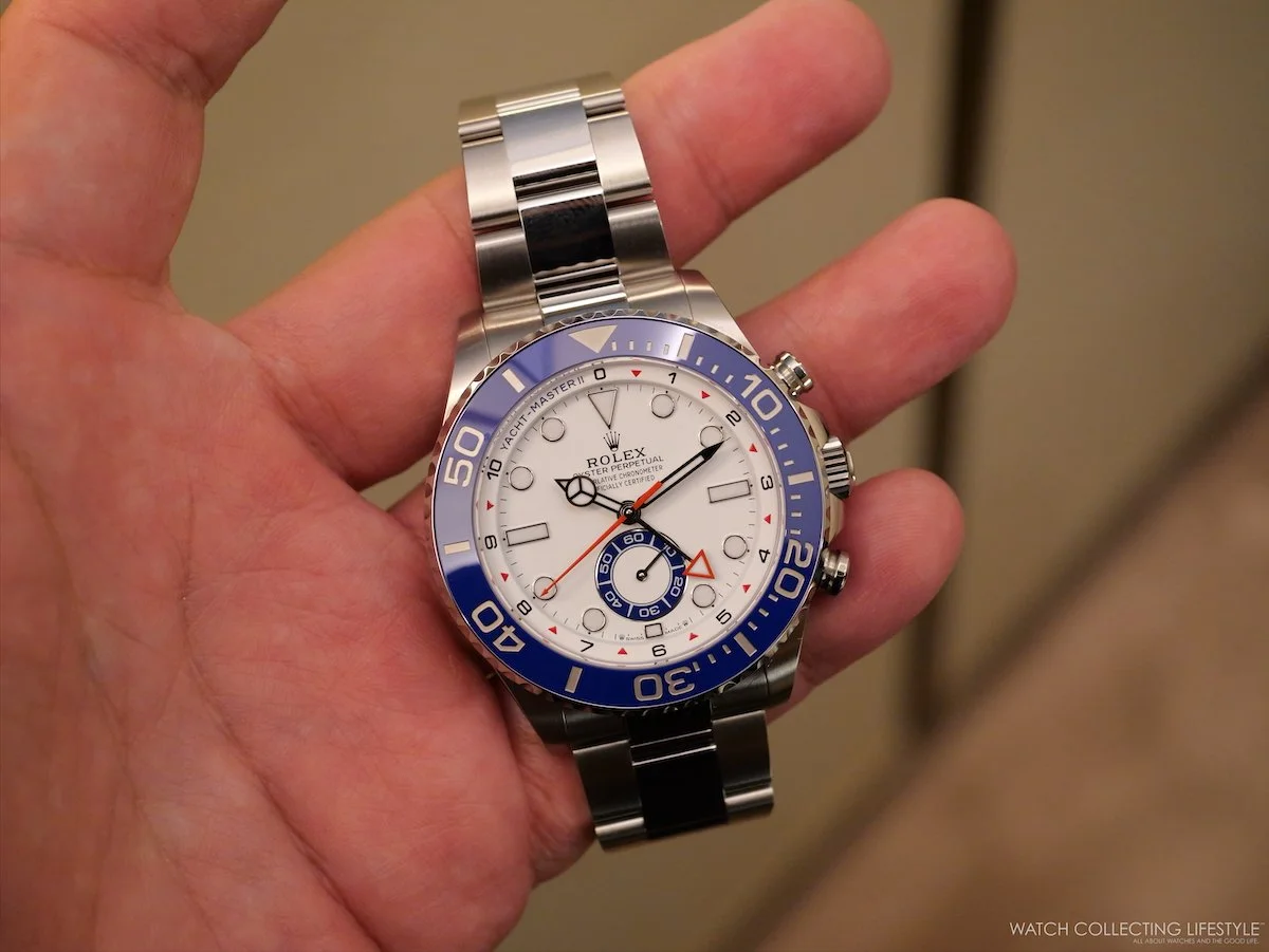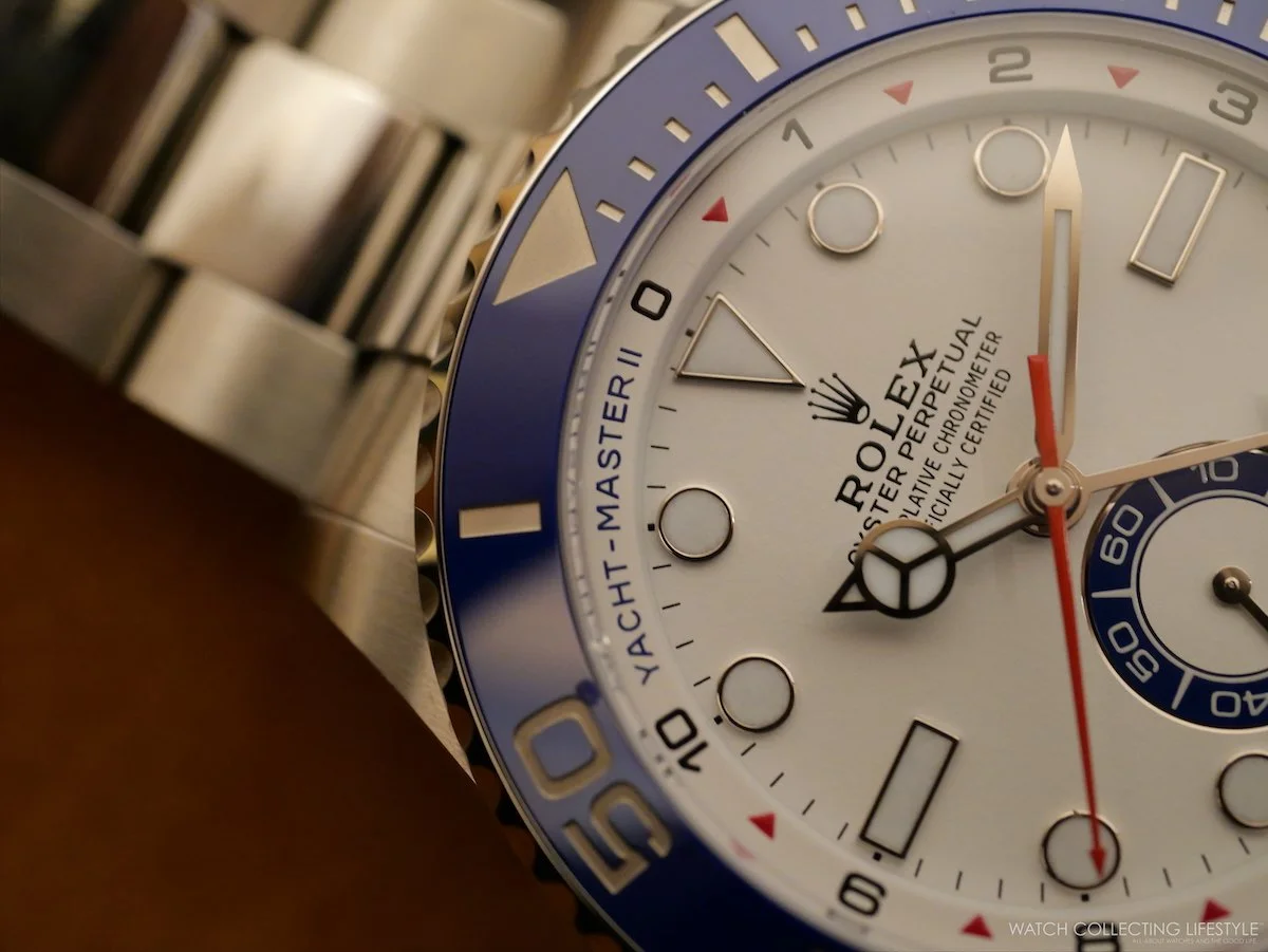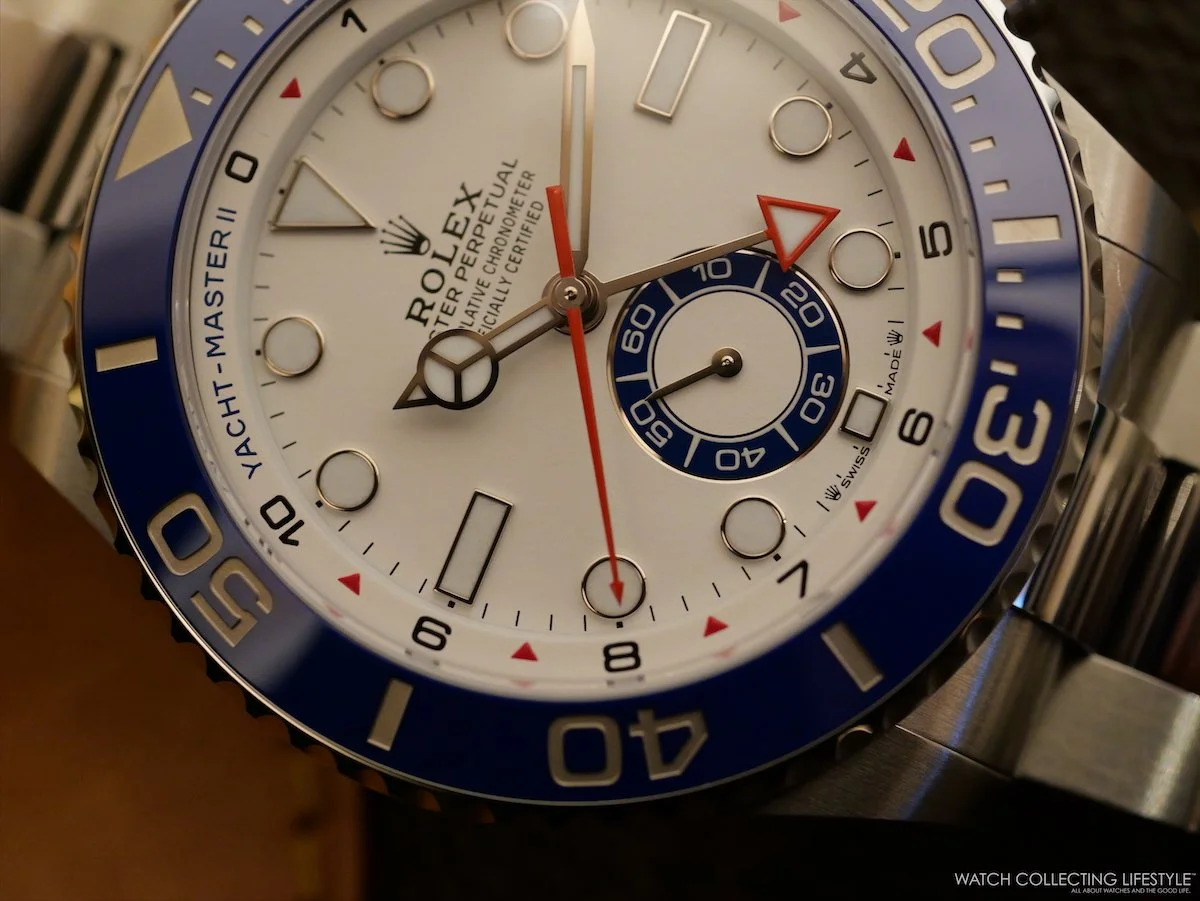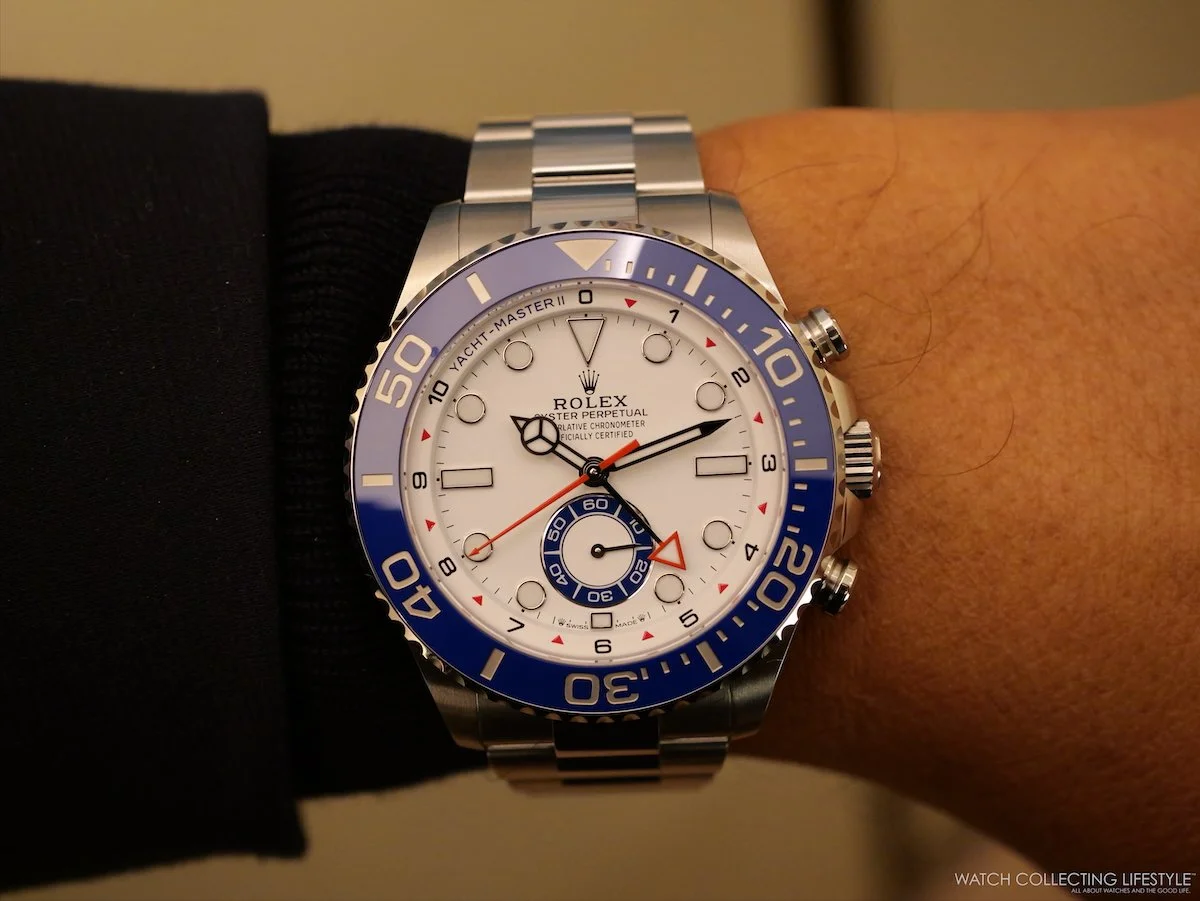 On the wrist, the watch wears quite large and feels almost as big as a Deepsea. On a 7.25-inch wrist, the 44 mm case wears exactly as intended—substantial without being overwhelming—, the proportions landing closer to a serious tool watch than a showpiece. The blue Cerachrom bezel dominates the visual presence—we think the diving bezel has no place on this watch, and somehow the bezel specific to the Yacht-Master II should’ve been redesigned—, along with the white lacquer dial reading with remarkable clarity even at a glance. The red accents on the steel version really complete the sporty look.