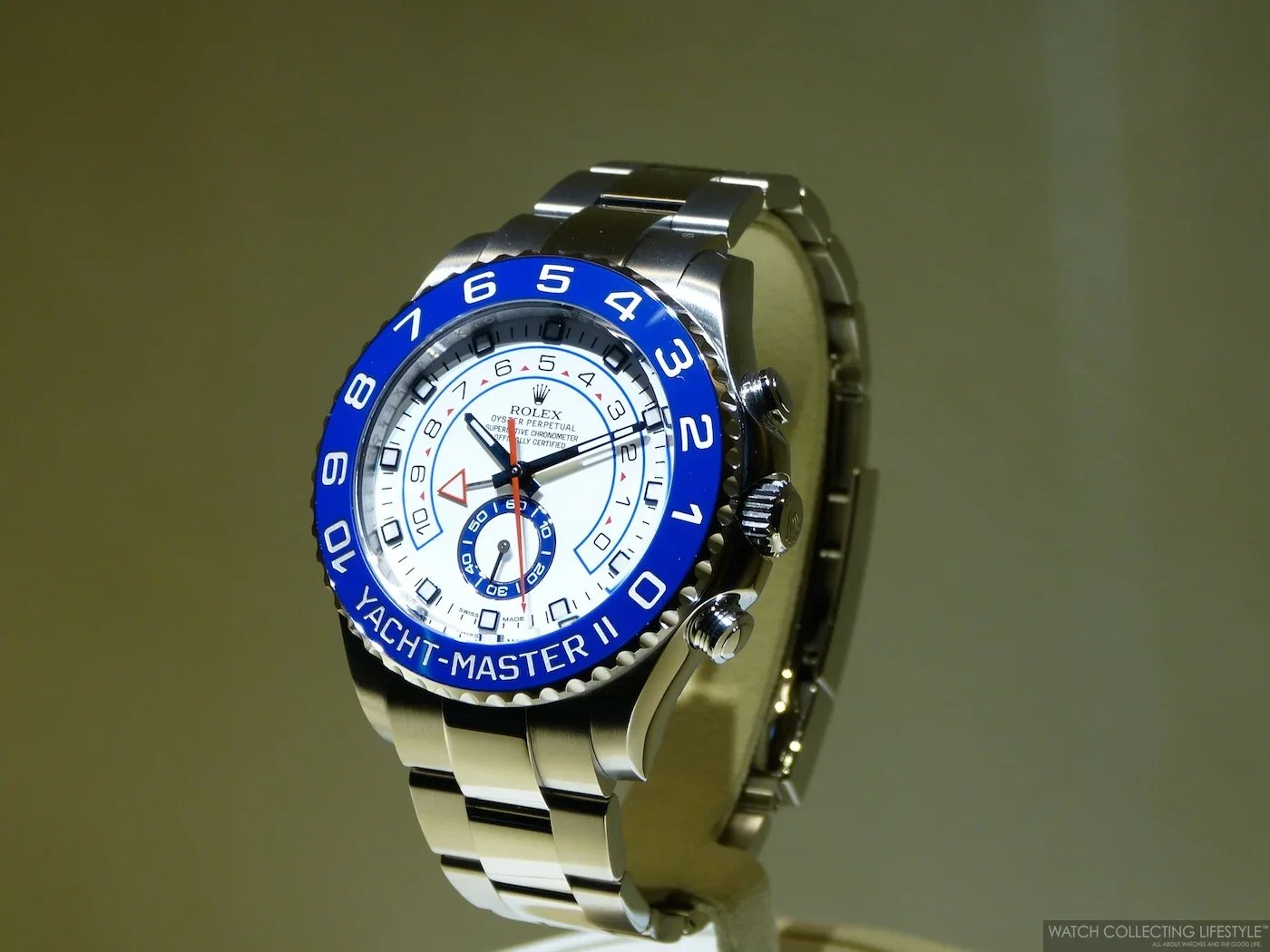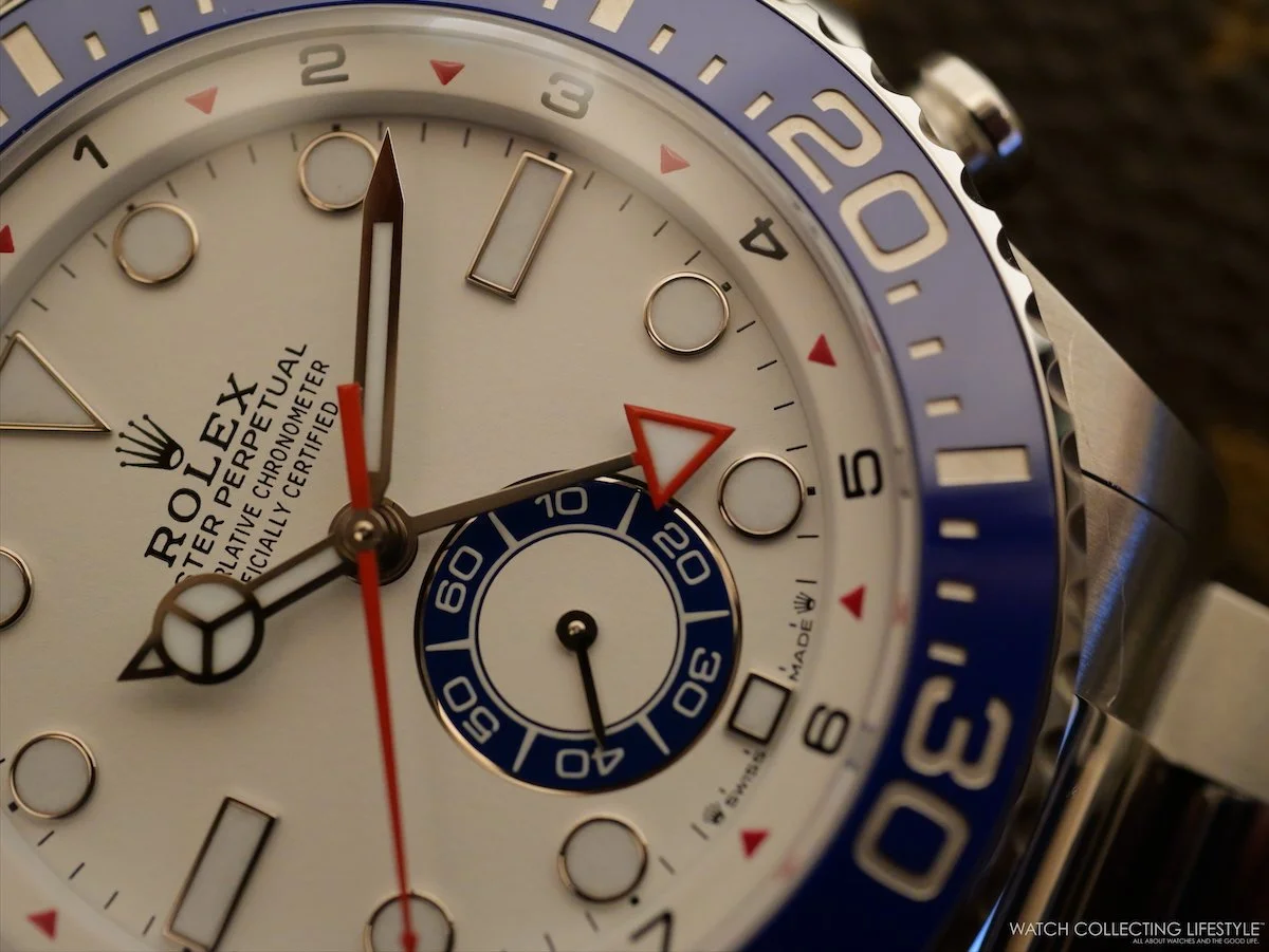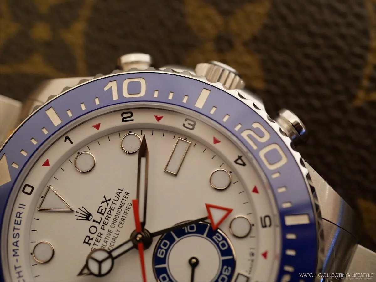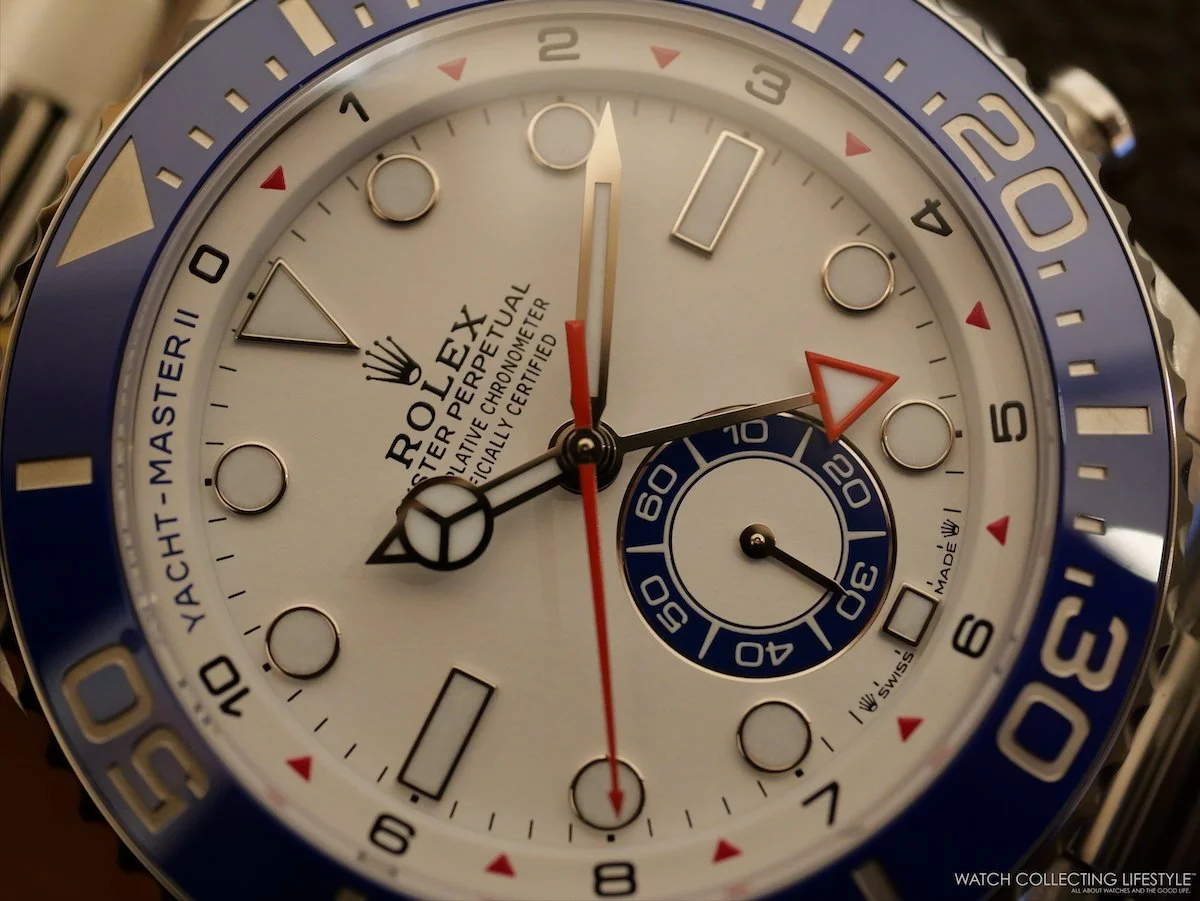 On the wrist, the watch wears quite large and feels almost as big as a Deepsea. On a 7.25-inch wrist, the 44 mm case wears exactly as intended—substantial without being overwhelming—, the proportions landing closer to a serious tool watch than a showpiece. The blue Cerachrom bezel dominates the visual presence—we think the diving bezel has no place on this watch, and somehow the bezel specific to the Yacht-Master II should’ve been redesigned—, along with the white lacquer dial reading with remarkable clarity even at a glance. The red accents on the steel version really complete the sporty look.