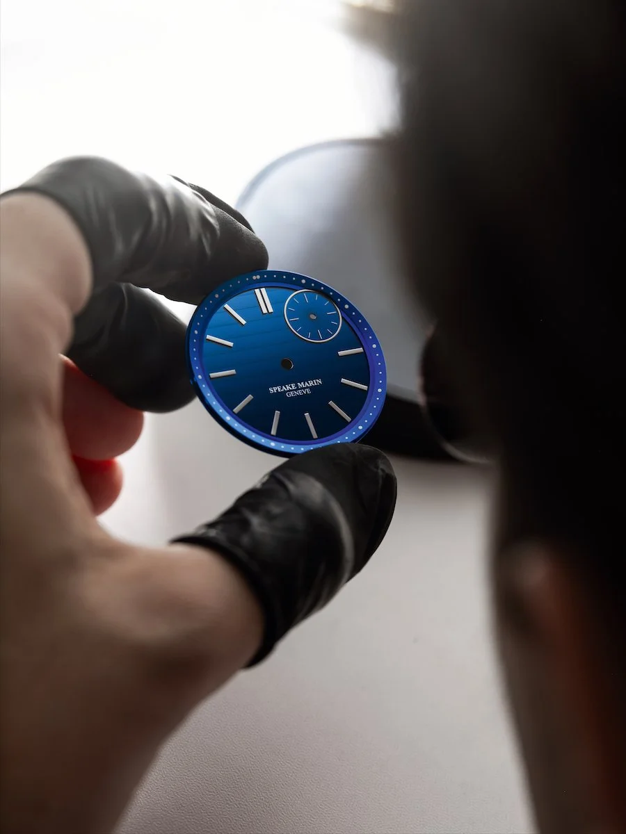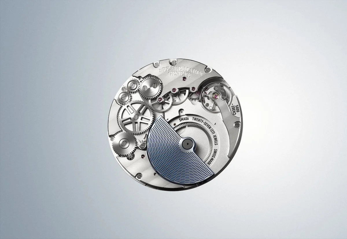 At the heart of the piece is the SMA06, an automatic calibre conceived and engineered entirely at Le Cercle des Horlogers, Speake Marin's manufacture in La Chaux-de-Fonds. At just 2.5 mm thick, the movement runs at a high-frequency 5 Hz (36,000 vph), delivering the kind of chronometric stability and smooth seconds-hand sweep typically reserved for movements with considerably more case depth to work with. An integrated micro-rotor—now a hallmark of the brand—keeps the profile slim while featuring an intricate laser-engraved pattern of alternating rhodium-plated and blue PVD rectangles that visually connects the movement to the dial above. The brand quotes a minimum 52-hour power reserve.