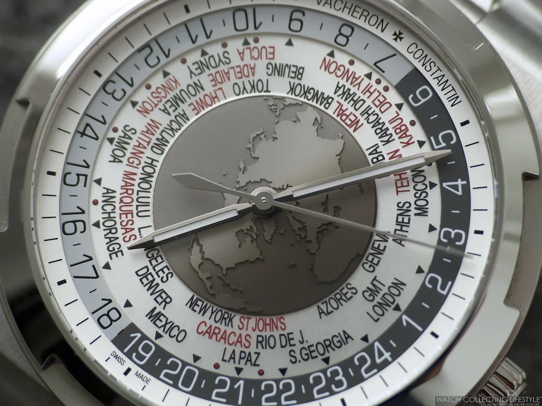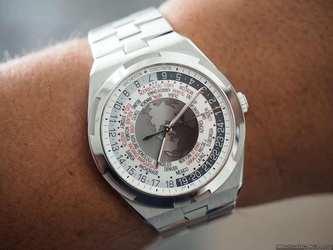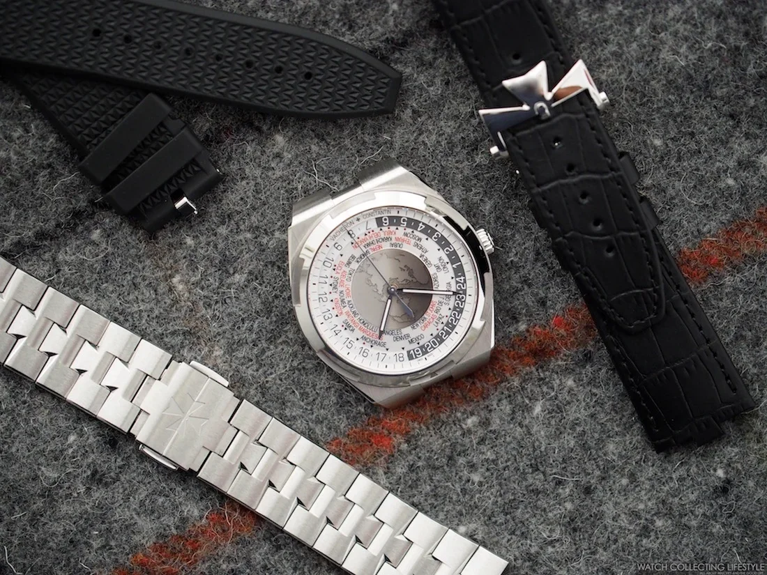 Vacheron Constantin's Overseas World Time with a chocolate brown dial combines travel functionality with exceptional aesthetics. The 43.5 mm stainless steel case houses a complex three-disc dial construction featuring a Lambert projection map with a brown sunburst finish. Yellow accents punctuate the 37 time zones, creating warmth and visual interest. The interchangeable strap system—including steel bracelet, rubber, and alligator options—makes this sophisticated worldtimer remarkably versatile for the modern traveler seeking both technical capability and refined style.