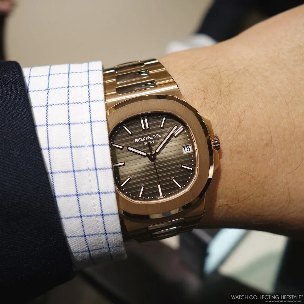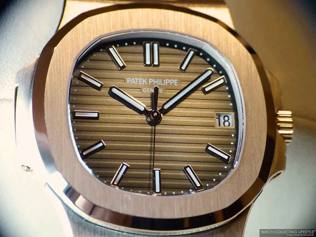 The Nautilus in rose gold with chocolate dial represents perhaps the most coveted interpretation of Gerald Genta's legendary design. The guilloché horizontal pattern creates mesmerizing reflections that shift from deep brown to light cream, depending on the lighting. At the same time, the warmth of 18K rose gold perfectly complements the dial's rich tones. At 40mm, this discontinued reference has become legendary among collectors—an actual grail piece that captures elegance without ostentation.