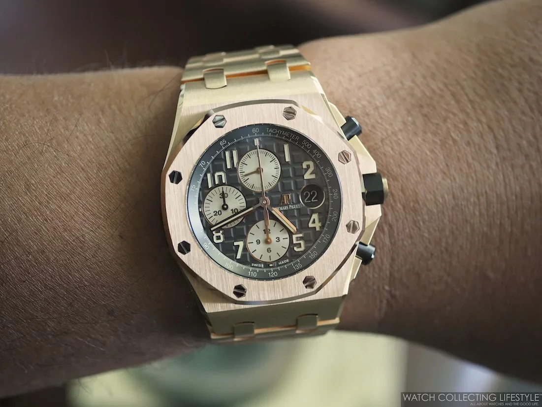 The Royal Oak Offshore in 18K rose gold with its distinctive brick ruthenium dial that appears more brown than anything, offers a sophisticated alternative to traditional brown. The 42 mm case balances sporting robustness with refined aesthetics, while the Grande Tapisserie pattern adds dimensional depth. The unique grey-brown hue creates an earthy, warm presence that perfectly captures autumn's essence. Powered by the chronograph caliber 3126/3840, this bold yet elegant timepiece demonstrates how Audemars Piguet transforms the Offshore into something exceptionally refined when executed in precious metal with carefully chosen dial tones.