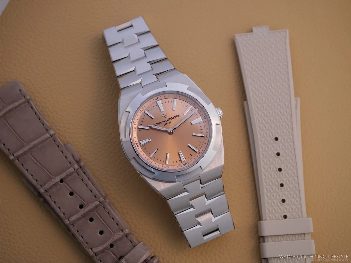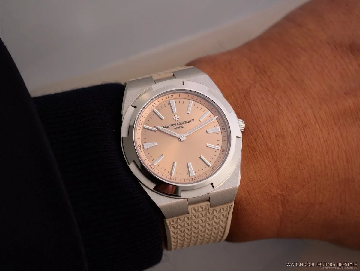 Seven years of development for a movement only 2.4 mm thick. Calibre 2550—the direct successor to the legendary 1120—debuts in the thinnest Overseas ever made: 39.5 mm, 7.35 mm thin, in thermally hardened 950 platinum with a salmon-lacquered archive dial. The versatility of the straps and their color also made it a favorite in my book. A bidirectional platinum micro-rotor and a suspended double barrel deliver an 80-hour power reserve. The star of Watches and Wonders 2026. Limited to 255 pieces. Read the full editorial here.