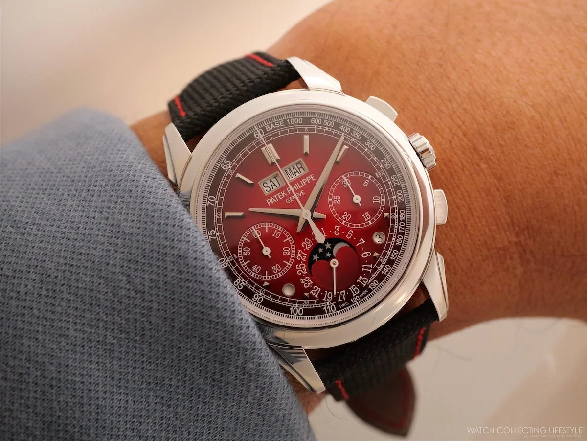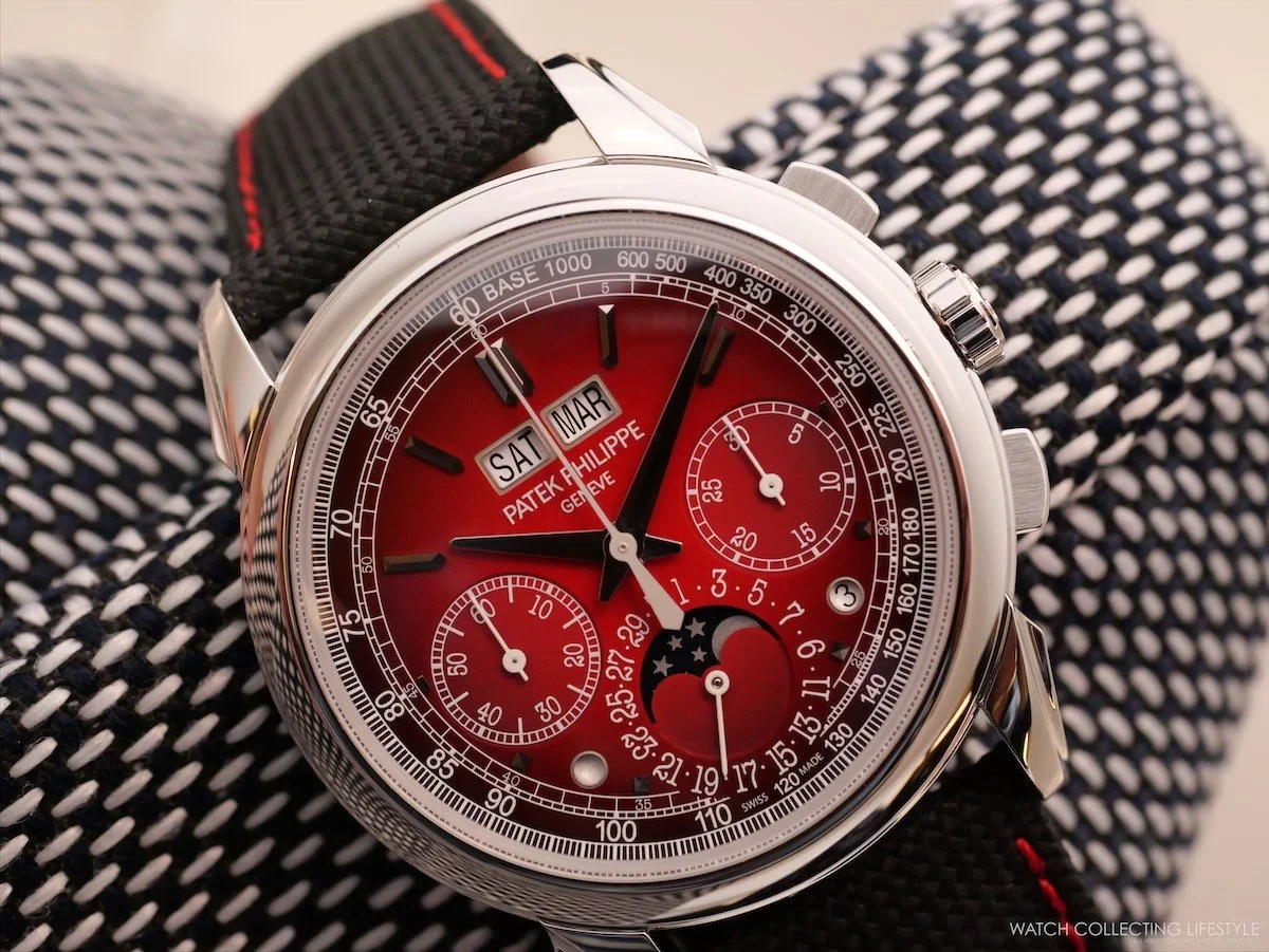 The 5270 in red lacquer with a black-gradient rim and platinum case is one of the most visually daring departures Patek has allowed itself in years—almost racing-inspired, without conceding a single mechanical principle. The composite strap with red stitching completes the proposition. One of the best-looking Pateks ever released. Read the full editorial here.