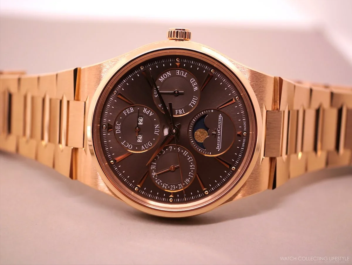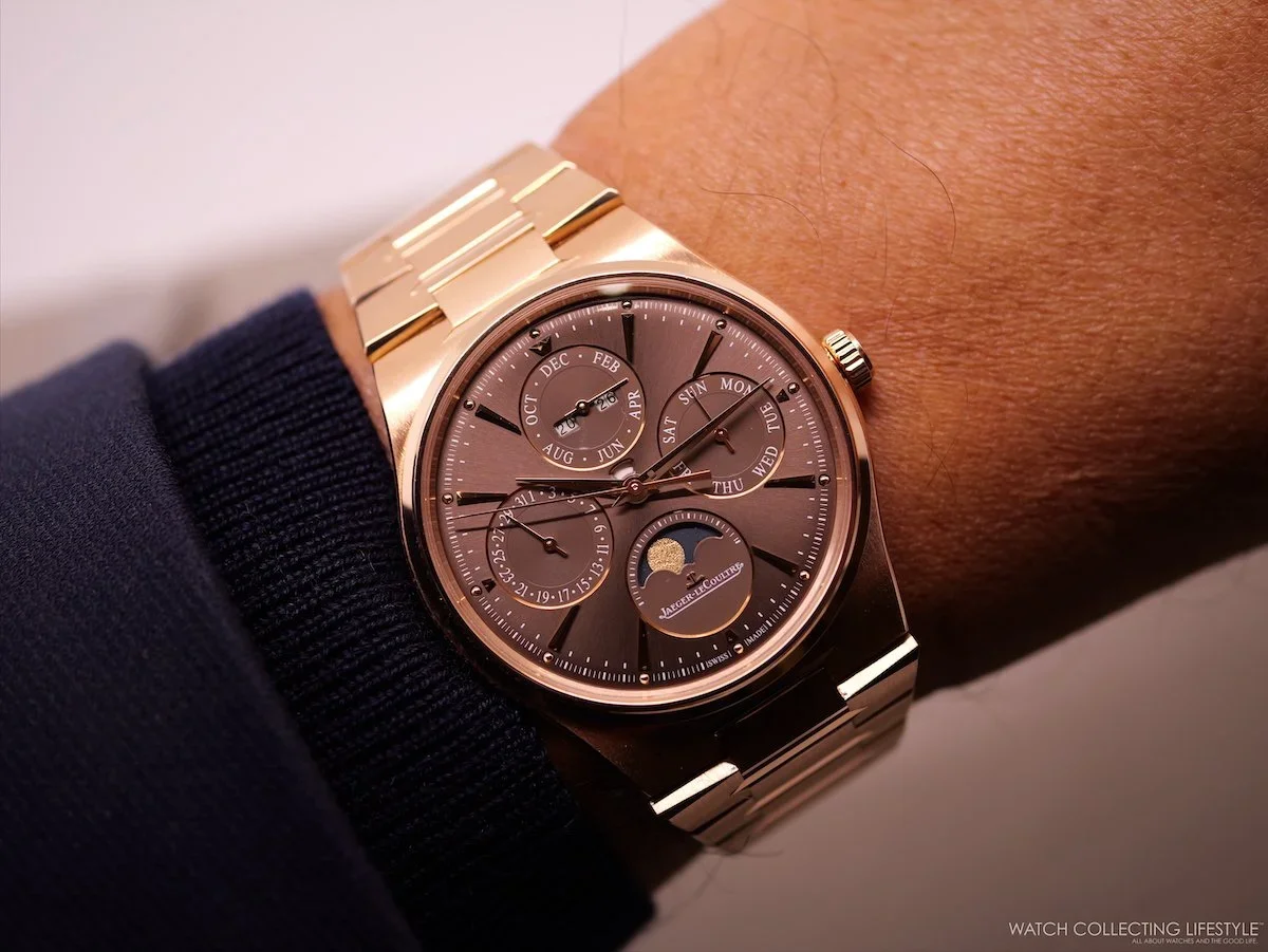 JLC's most considered release in years with a 39 mm case that is only 9.2mm thick, with an integrated bracelet that draws a direct line from the 1973 Master Mariner Chronomètre. Calibre 868 delivers a full perpetual calendar across four sub-dials with dual HPG/COSC certification, all in a movement measuring just 4.72 mm thick. The rose gold version, at 146 grams on the wrist, is substantial without ever feeling like it. Read the full editorial here.