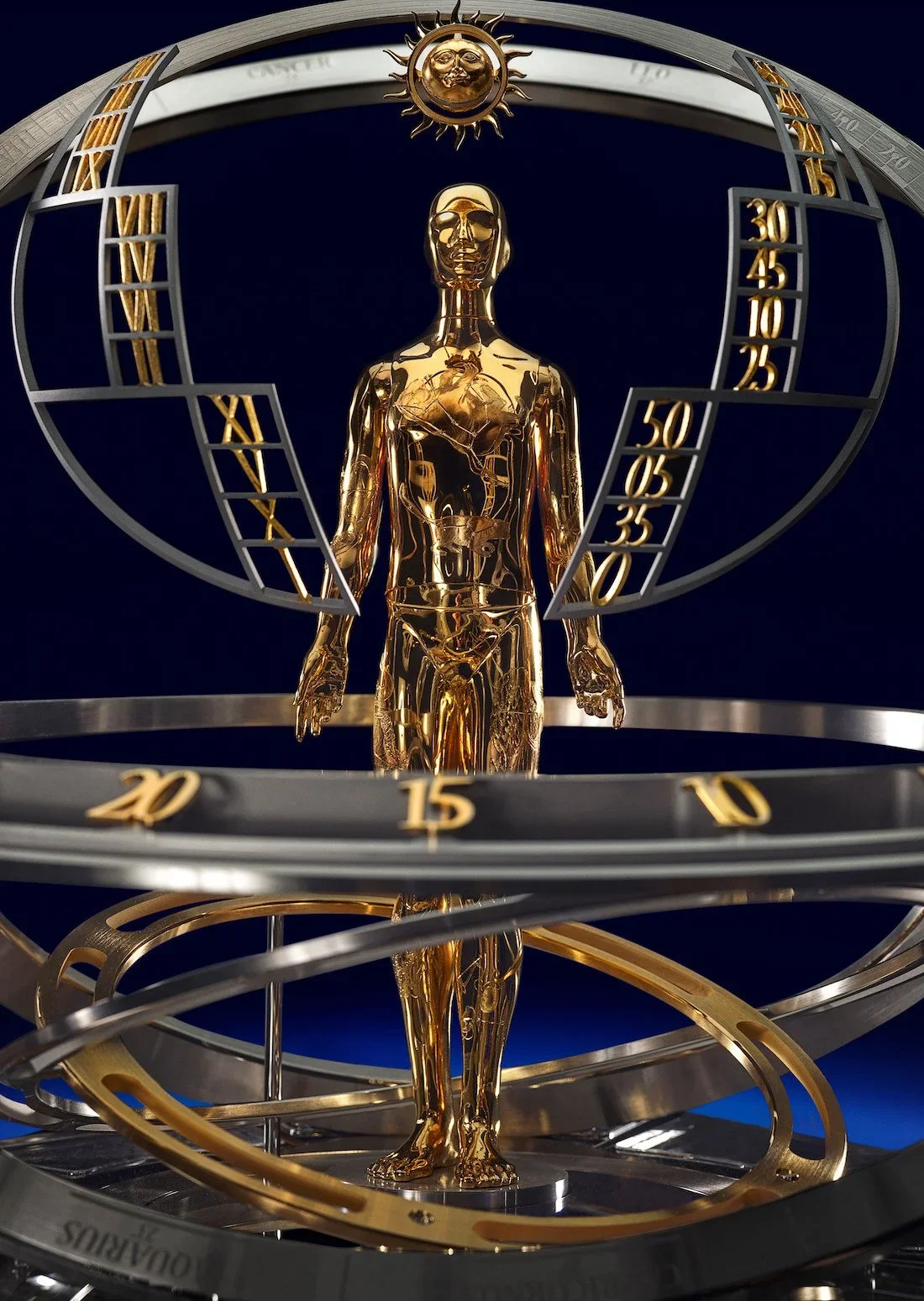 The centerpiece innovation is "The Astronomer" automaton—the first functional timekeeping automaton in horological history. This bronze figure, adorned with 122 diamonds representing constellation stars, performs choreographed sequences indicating hours and minutes through 144 unique gestures. The clock features a 15-day power reserve, Tourbillon with Maltese Cross cage, and perpetual calendar displays.
