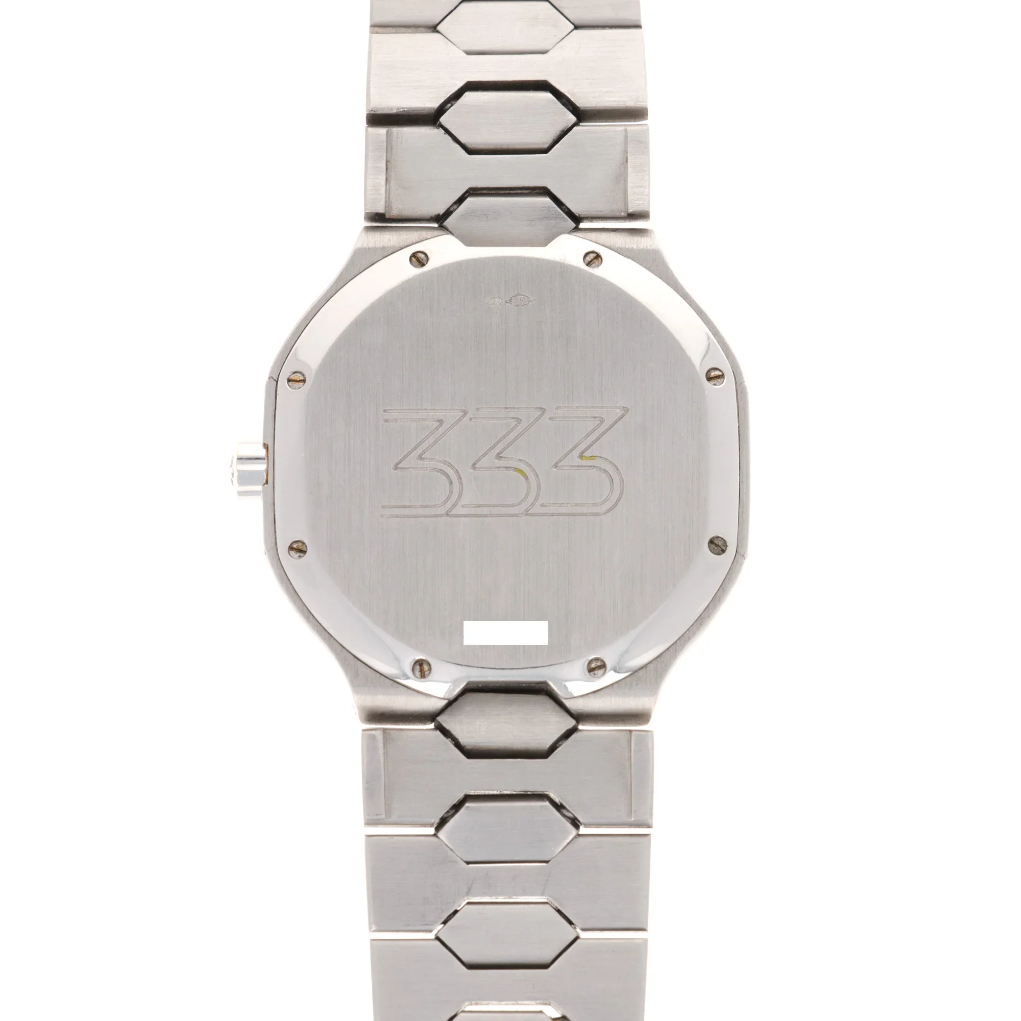 The reference 333 emerged in the 1980s as the manufacture's second generation luxury sports watch with an integrated bracelet design following the reference 222. Distinguished by its octagonal case geometry, the 333 evolved from the earlier 222 while incorporating a more narrow bracelet construction when compared to the 222 and featuring distinctive polished and smaller hexagonal center links that merged fluidly with the case architecture.