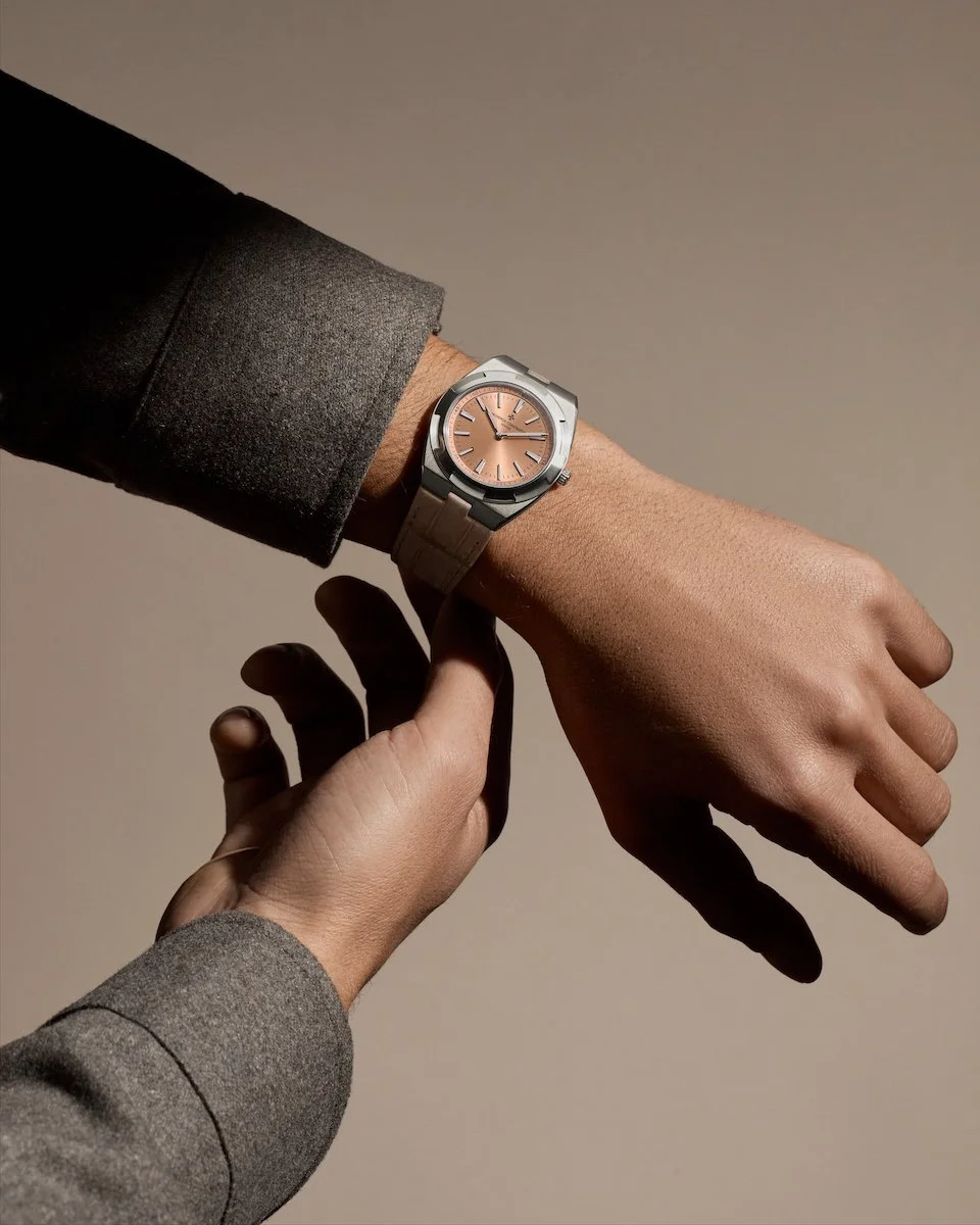With its refined, almost minimalist aesthetic, the timepiece features a sunburst satin finished salmon-lacquered dial, complemented by a velvet-finished peripheral minute track.