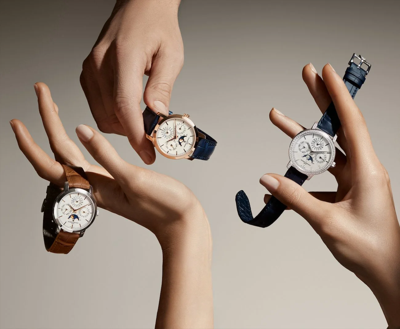 The pink gold version ref. 4300T/000R-H107 achieves tonal harmony with matching hands and markers against a dark blue alligator strap. The white gold model ref. 4300T/000G-H106 plays with contrast, featuring pink gold accents and a fresh light-brown alligator strap. The diamond-set variant ref. 4305T/000G-H135 adds 76 brilliant-cut diamonds to the bezel and lugs—approx 0.96 carats—, plus a diamond-set crown and buckle, totaling approximately 1.19 carats.