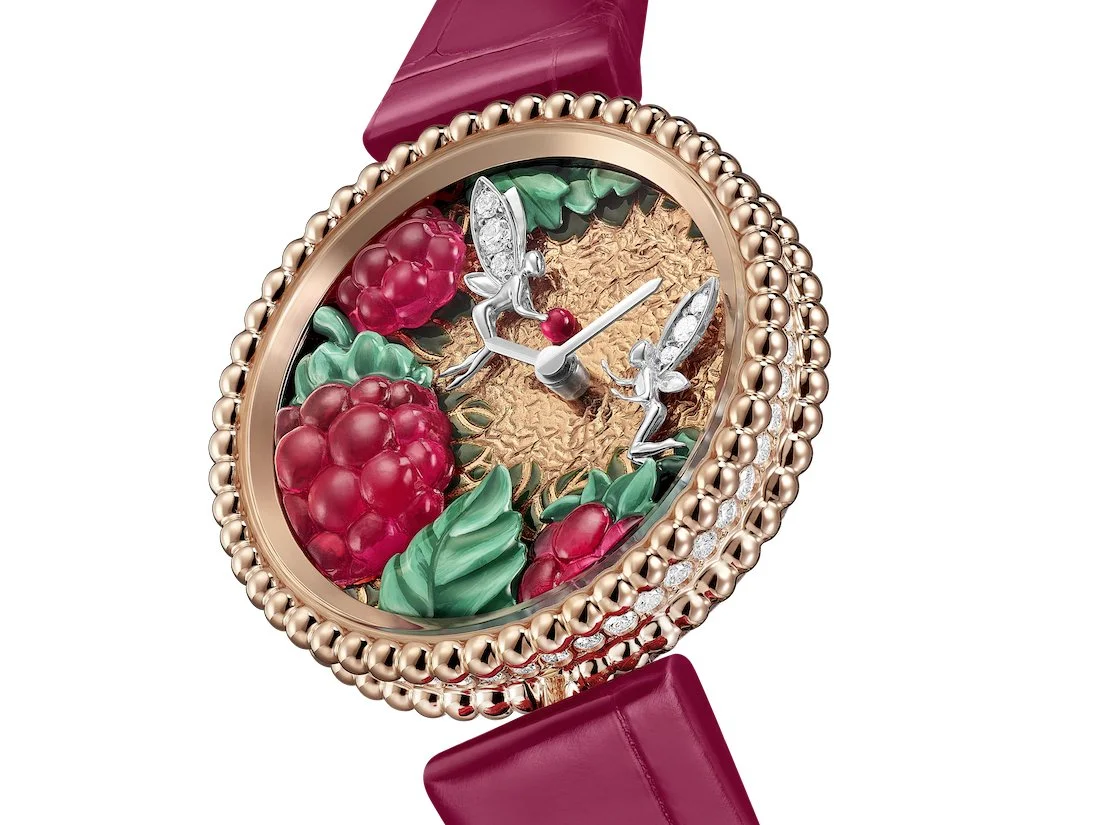 The new Myrtille—Blueberry— and Framboise—Raspberry—timepieces are nothing short of miniature masterpieces, each dial a sun-drenched orchard frozen in time. These aren't simply watches adorned with fruit motifs; they are three-dimensional sculptures that celebrate the voluptuous curves and brilliant luster of summer berries through the revolutionary façonné enamel technique—a proprietary innovation developed exclusively by Van Cleef & Arpels in 2023.
