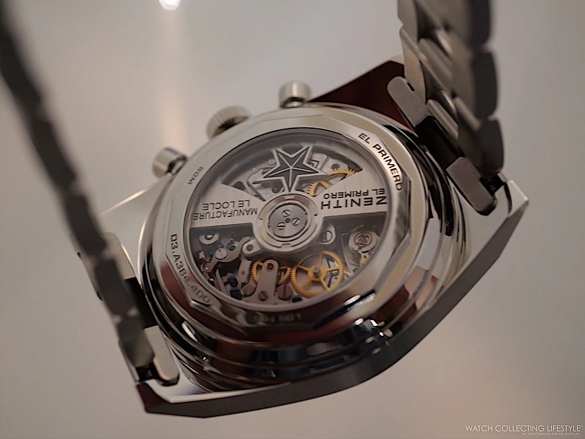 The Chronomaster Revival A384 is powered by the El Primero 400, the most direct descendant of the original caliber 3019 PHC. Developed and manufactured entirely in-house, it beats at 36,000 vph, enabling chronograph measurements to 1/10th of a second. Composed of 278 parts, it delivers a power reserve of 50 hours. The sapphire case back reveals the star-shaped skeletonized rotor with Côtes de Genève finishing on the oscillating weight.